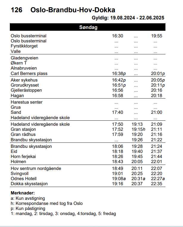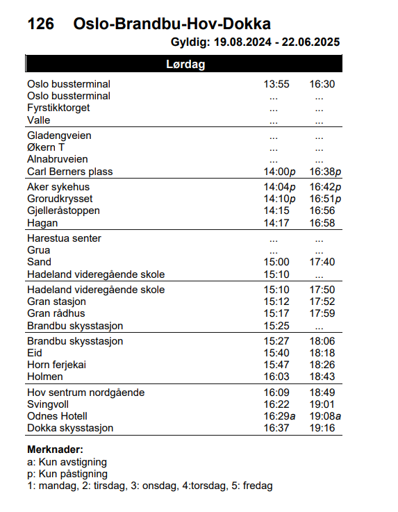 Rutetider for Bussrute Dokka – Hov – Brandbu – Oslo Linje 126