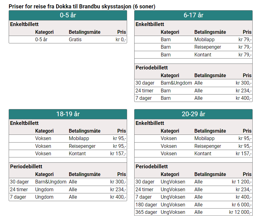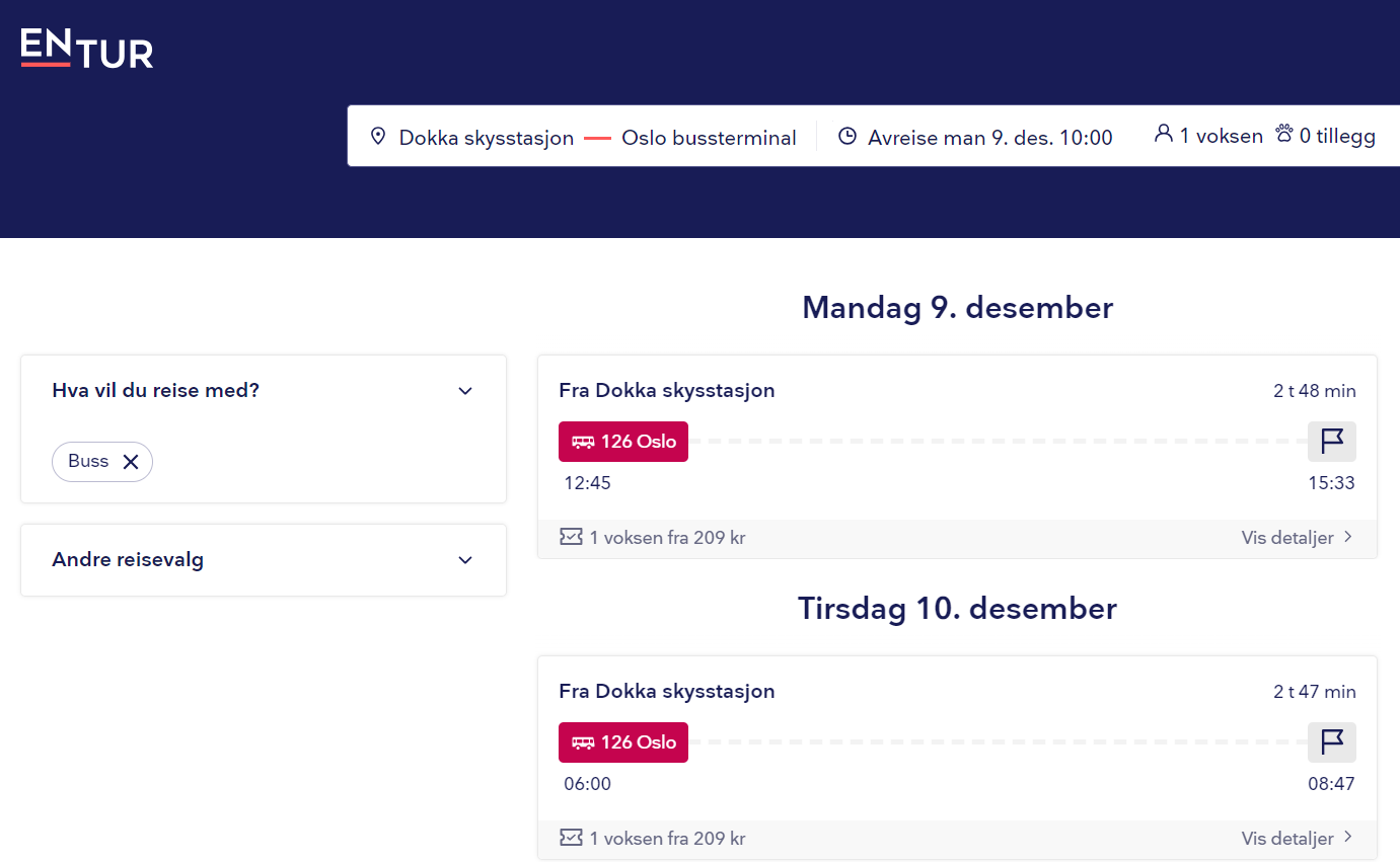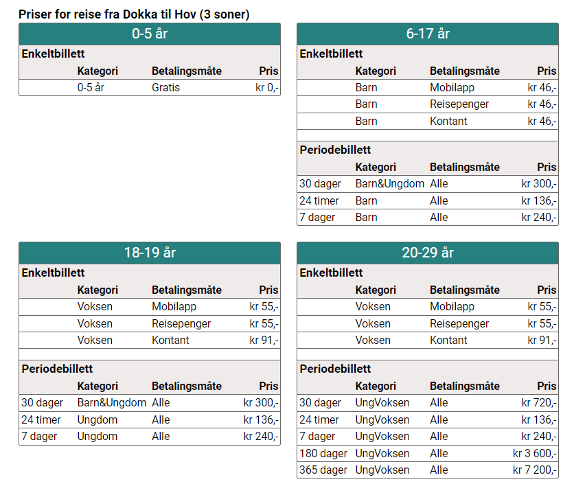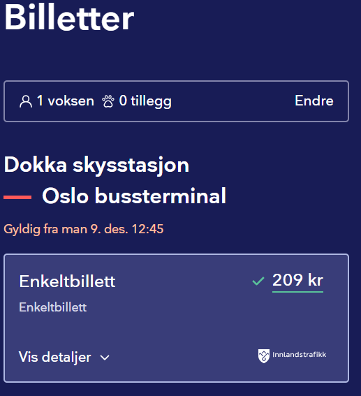 Priser Dokka – Oslo eller Oslo – Dokka (Entur)