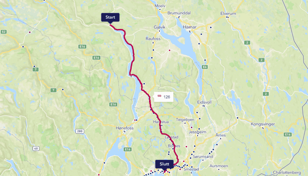 Kart Buss Bussrute Dokka – Hov – Brandbu – Oslo Linje 126