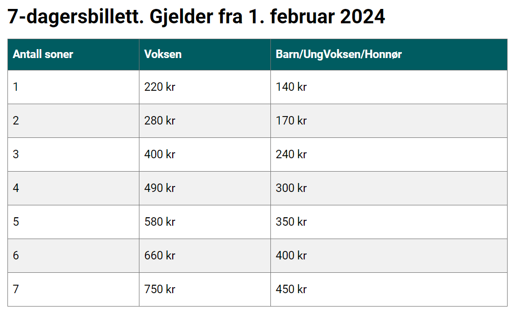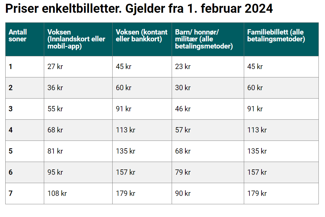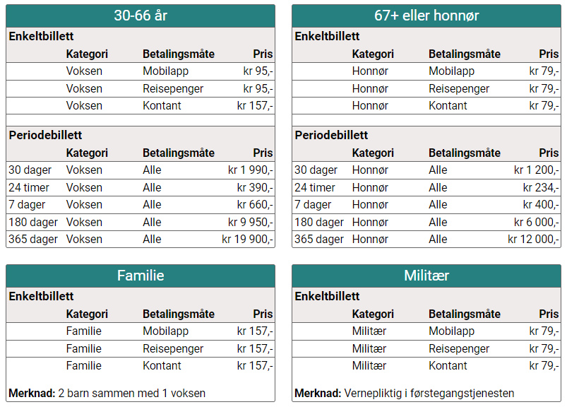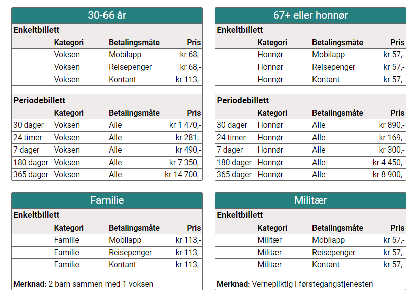 - Betalingsmåter: Bankkort eller kontanter (NOK).