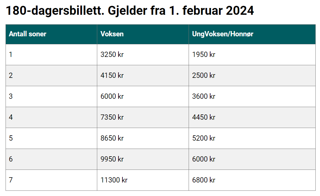Kjøp for 6 måneder og betal kun for 5! Gyldig i 180 dager for ubegrenset antall turer. Tilgjengelig i Entur-appen eller på Innlandskort.