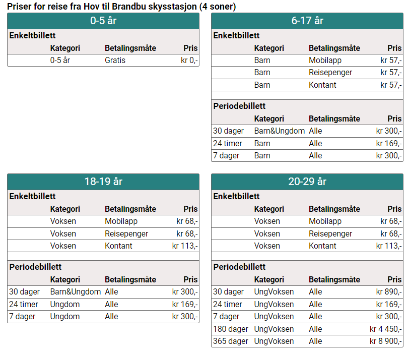 Priser for Bussrute Dokka – Hov – Brandbu – Oslo Linje 126