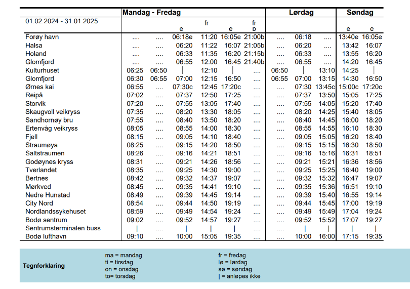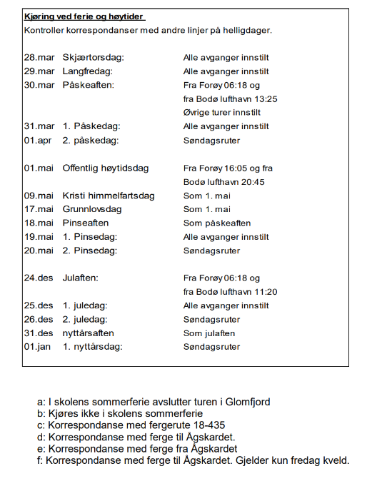 - Under skoleferier kjøres noen avganger ikke, eller turen avsluttes tidligere, spesielt til/fra Glomfjord eller Forøy havn.