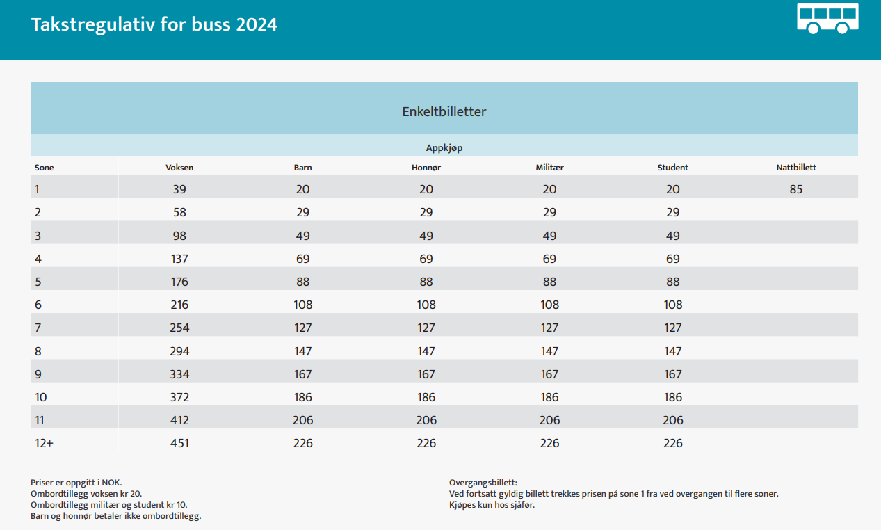 Ved kjøp av enkeltbillett på bussen tilkommer et ombordtillegg: