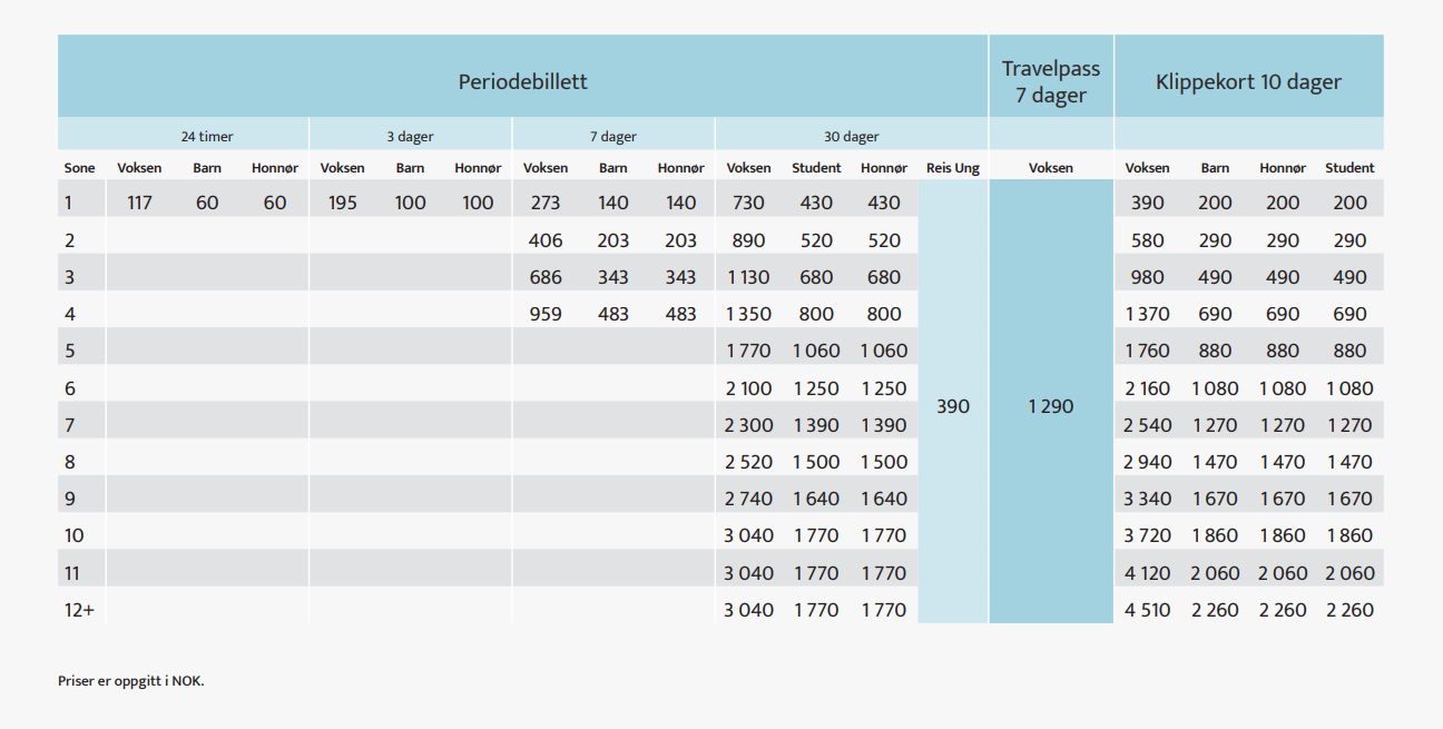- Hver reise beregnes basert på antall soner du krysser underveis.