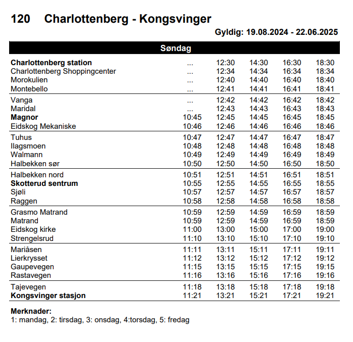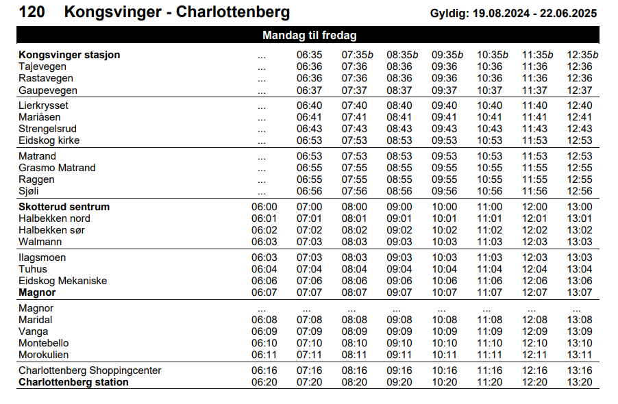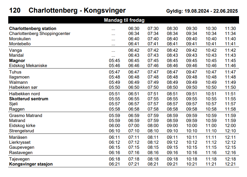 - Hyppige avganger fra Kongsvinger stasjon hver time, med første buss kl. 06:35 og siste avgang kl. 20:35.