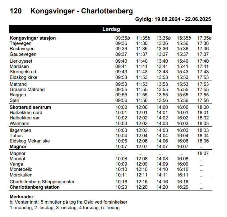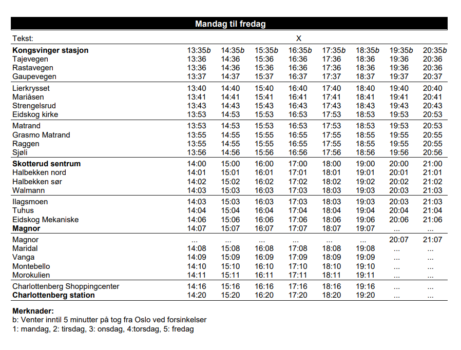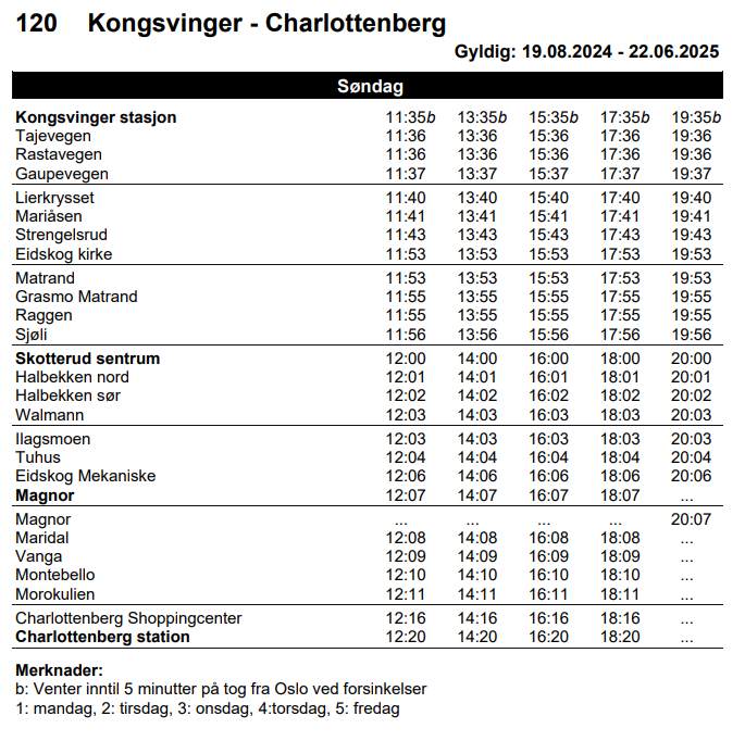 - Noen avganger er merket med bokstaven b, som betyr at bussen kan vente i opptil 5 minutter dersom toget fra Oslo er forsinket, noe som forbedrer den multimodale transportintegrasjonen.
