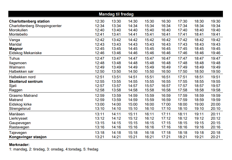 - Tilpassede rutetider for helgen, med avganger fra Kongsvinger hver andre time mellom kl. 11:35 og 19:35.