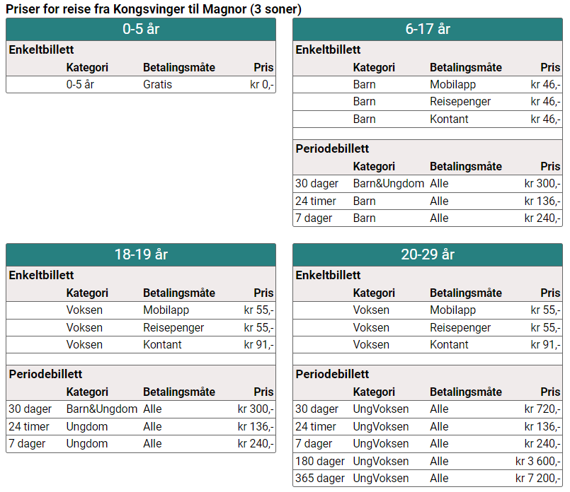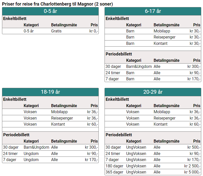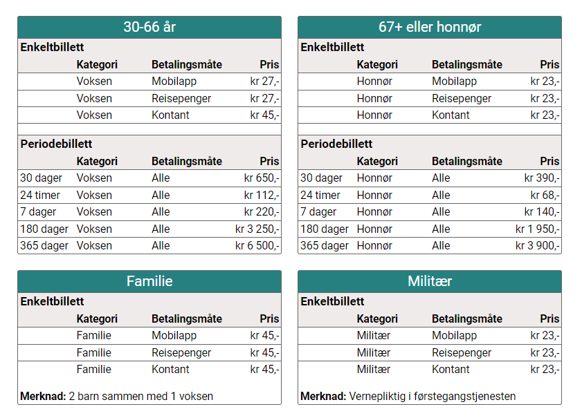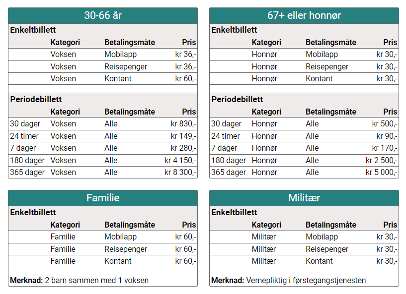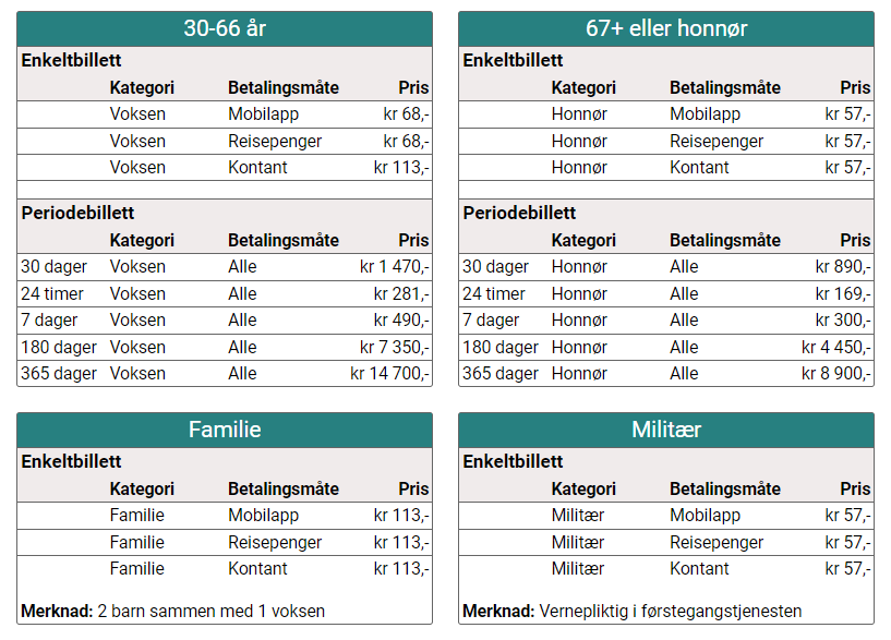 | Antall soner | Voksen (Innlandskort eller mobil-app)(NOK) | Voksen (Kontant elle bankkort)(NOK) | Barn/Honnør/militaer(alle betalingsmetoder) (NOK) | Familiebillett(alle betalingsmetoder) (NOK) |