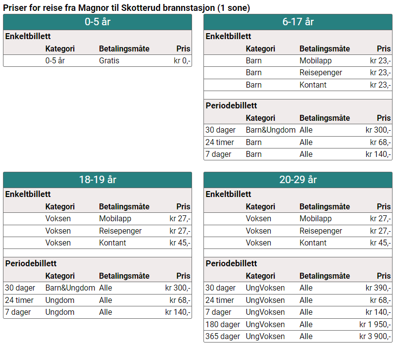 Nedenfor finner du en oversikt over prisene for hele ruten, samt utvalgte stopp underveis. Slik får du en bedre oversikt over kostnadene avhengig av distanse og antall soner du passerer gjennom.