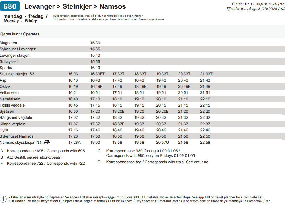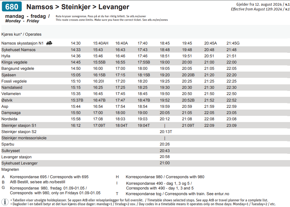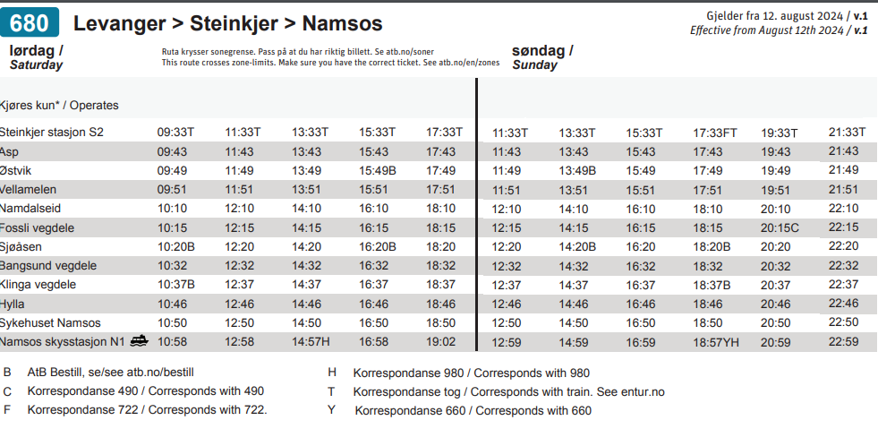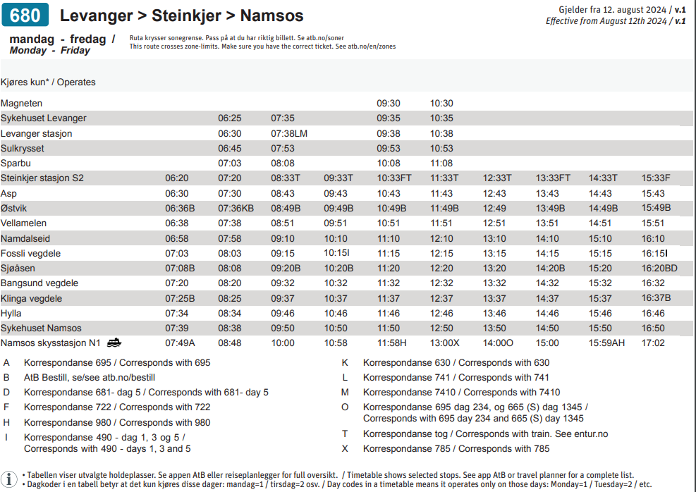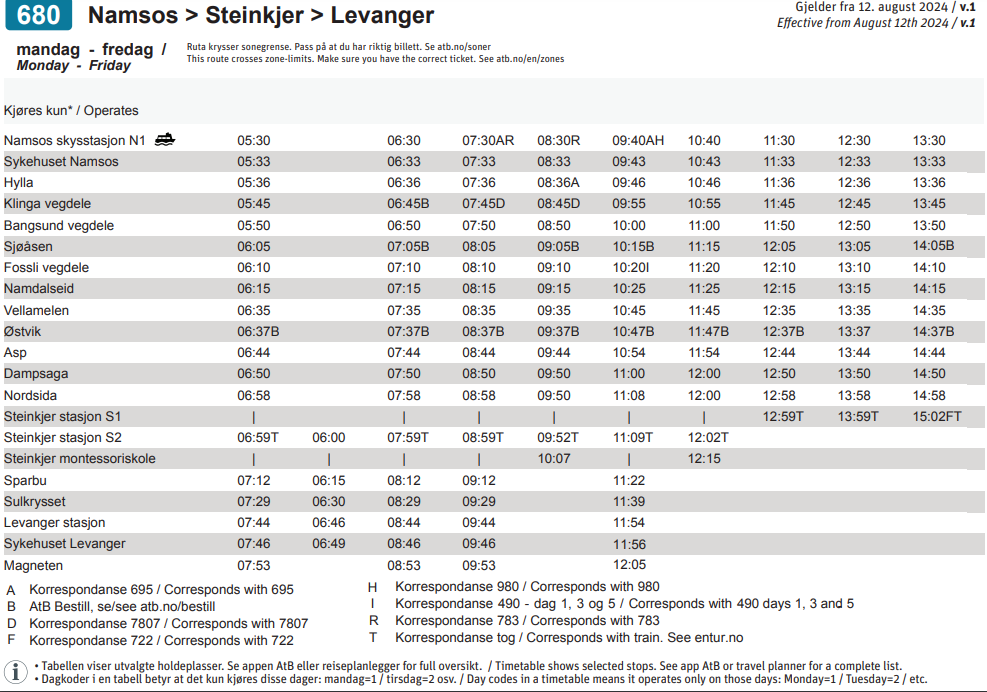 Rute 680 forbinder byene Namsos, Steinkjer og Levanger, og tilbyr en pålitelig bussforbindelse med stopp på viktige steder som sykehus, togstasjoner og andre strategiske punkter langs ruten. Denne tjenesten kjører hver dag med tilpassede tider for å sikre gode forbindelser til andre busslinjer og regionale tog. Det er et ideelt valg for dagpendlere, sykehusbesøk eller arbeidsreiser. Ruten krysser sonegrenser, så det er viktig å ha riktig billett før du starter reisen.